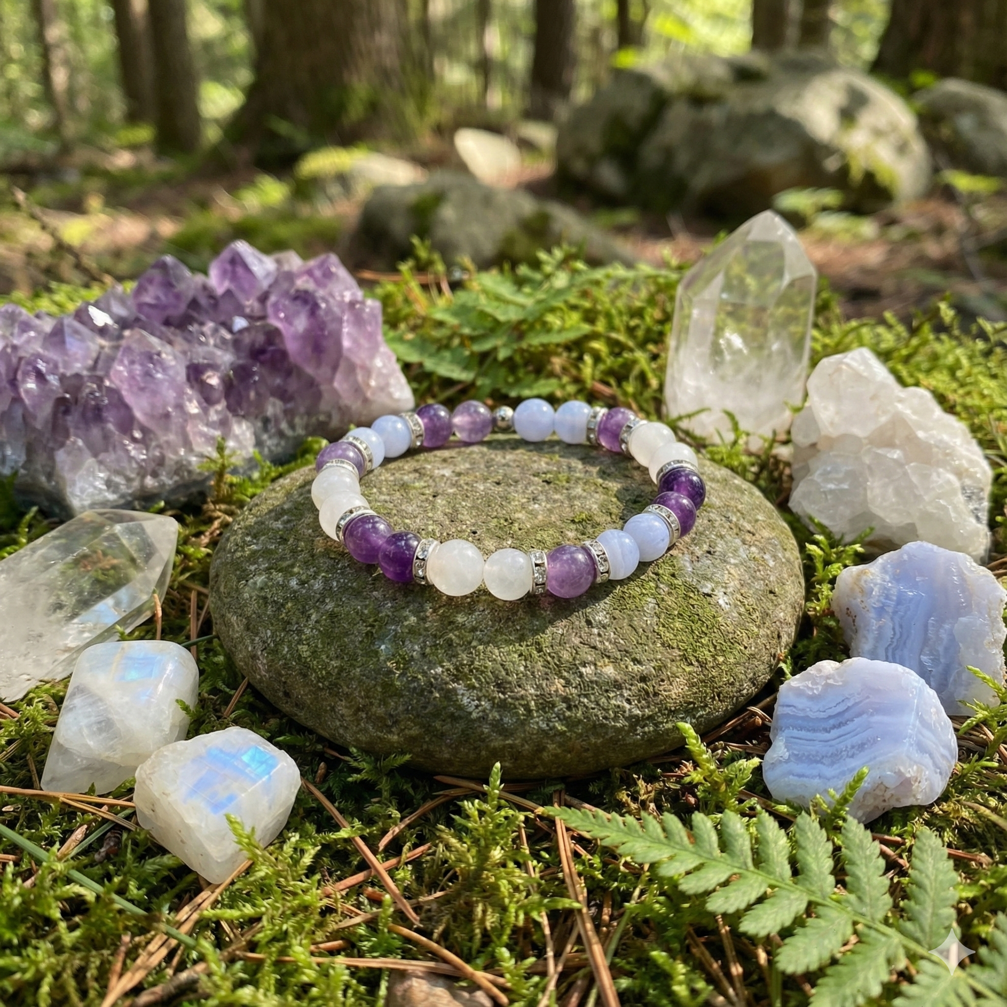 Every Sereniva bracelet combines four carefully selected healing stones — Moonstone, Blue Chalcedony, Amethyst, and Lepidolite — handcrafted into jewelry you'll be proud to wear every day.