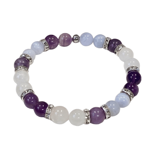 Grade A authentic moonstone, blue chalcedony, amethyst, and lepidolite. No chemicals, no synthetics. Each bracelet is unique, just like you.