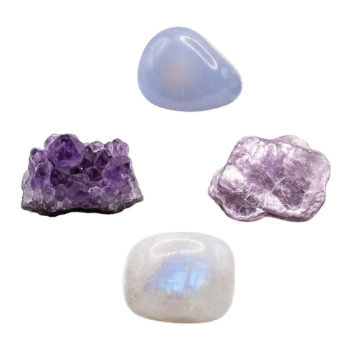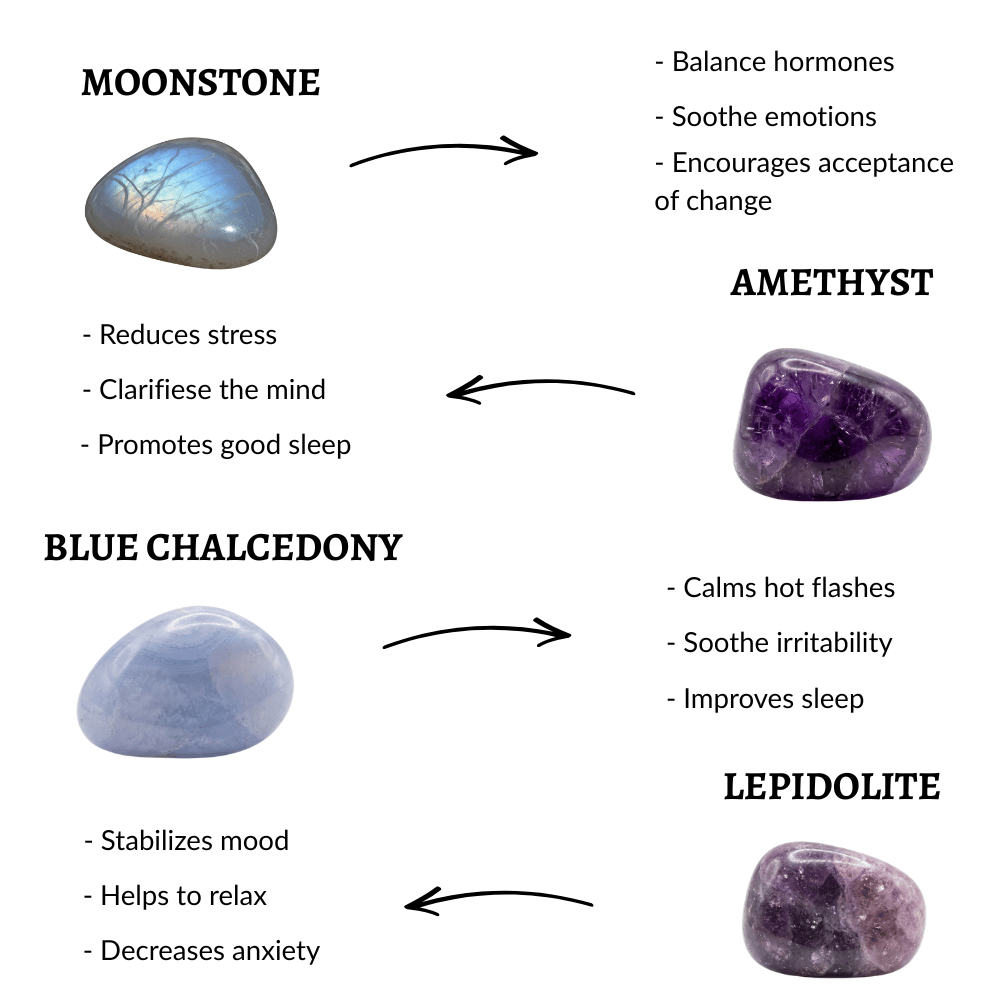 Moonstone for hormonal balance. Blue Chalcedony for cooling relief. Amethyst for restful sleep. Lepidolite for calm and stability.